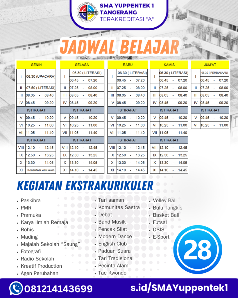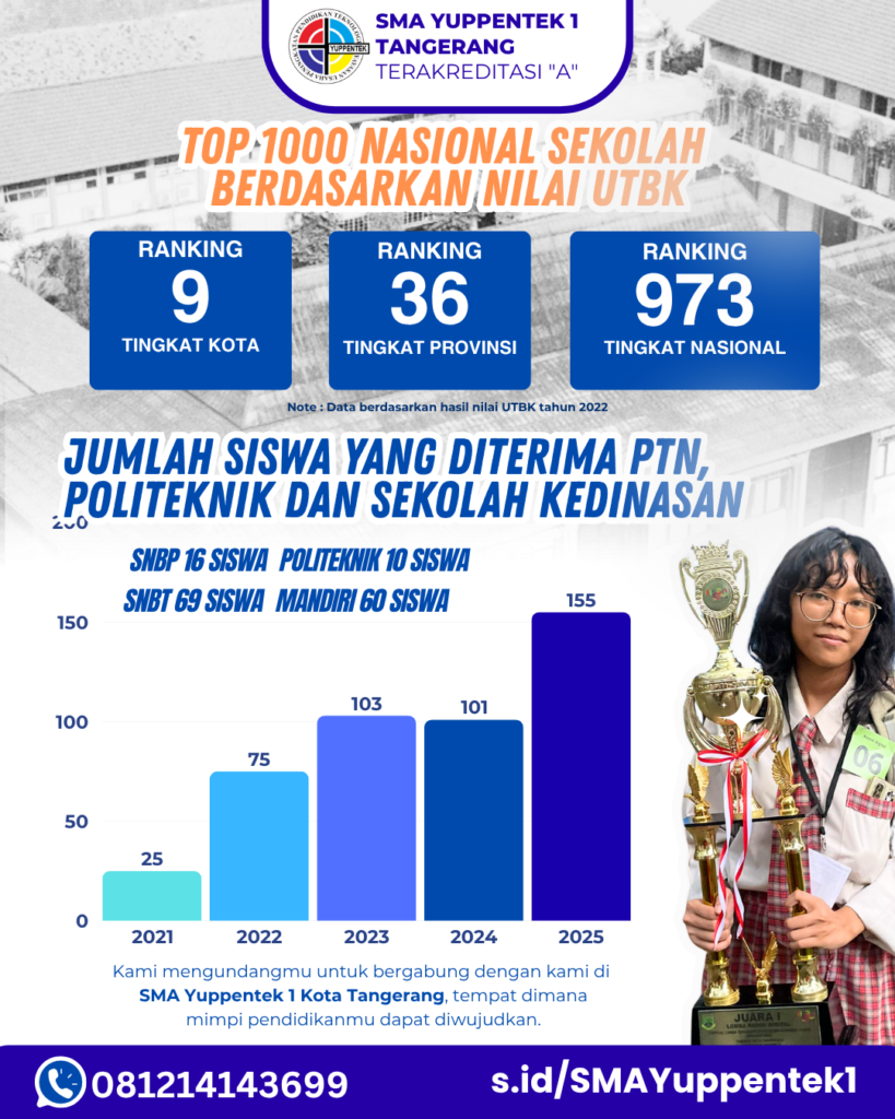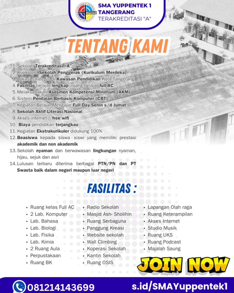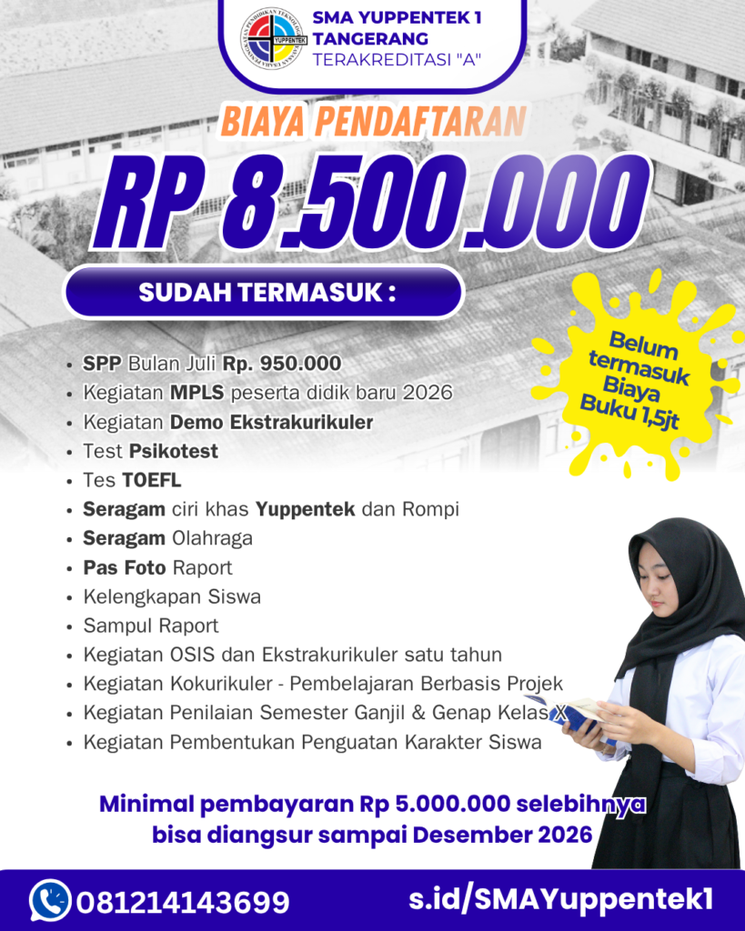 Dengan semangat untuk terus mencetak generasi unggul yang beriman, berilmu, dan berakhlak mulia, SMA Yuppentek 1 Tangerang mengundang putra-putri terbaik bangsa untuk bergabung dan tumbuh bersama dalam lingkungan pendidikan yang inspiratif dan berkarakter.